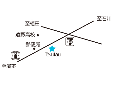 へ、のどかな田園地帯のまんなかにタユタウはあります。近くに美味しいお蕎麦屋さんや